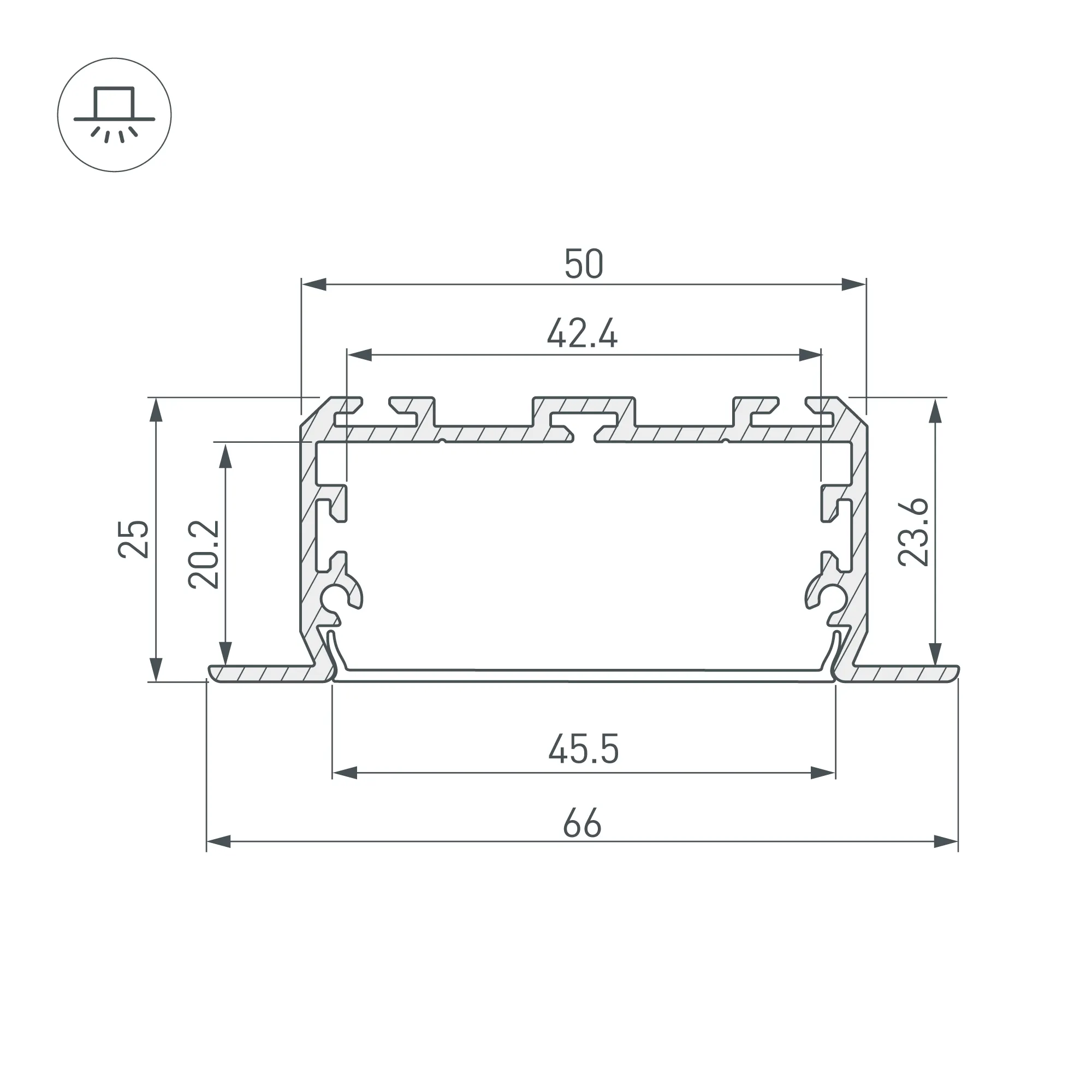 Алюминиевый анодированный встраиваемый профиль для светодиодных лент и линеек. Габаритные размеры (L×W×H): 2000x66x25 мм. Ширина площадки для ленты 48 мм. Экраны, заглушки и другие аксессуары приобретаются отдельно. Цена за 1 метр.