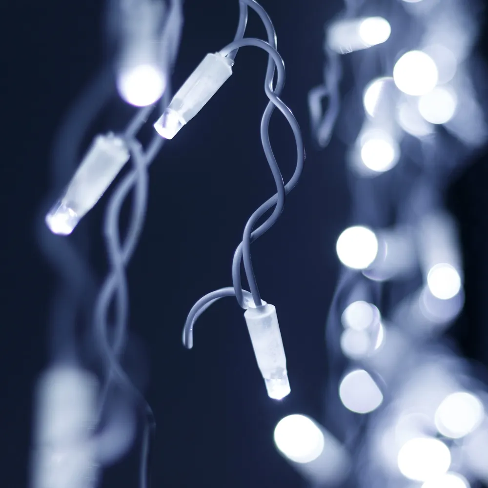 Светодиодная бахрома Pro. Размер 4000x600 мм (длина 4000 мм, по длине 32 нити высотой 200/600 мм). Количество светодиодов 128 шт размером 7 мм. Цвет свечения БЕЛЫЙ (6000 К), эффект постоянного свечения с мягким световым рисунком (выпуклая молочно-белая линза). Провод белый, резиновый. Питание 230 В, Мощность 8 Вт, защита IP65, применение на улице под навесом. Аксессуары для подключения приобретаются отдельно.