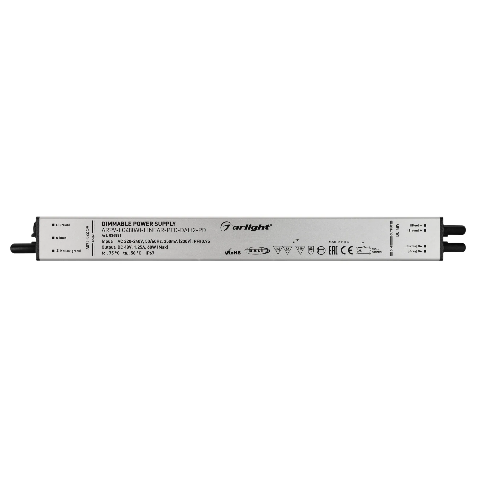Диммируемый блок питания 48V с гальванической развязкой, ток 1.25А, 60Вт, с управлением DALI, c функцией PUSH-DIM, с корректором мощности, PF>0,95. Тонкий металлический корпус IP67. Вход: 220-240VAC. Выход: 48VDC, ШИМ 1кГц. Размер 290х30х21 mm.. Соответствует требованиям EMC. Гарантия 5 лет.