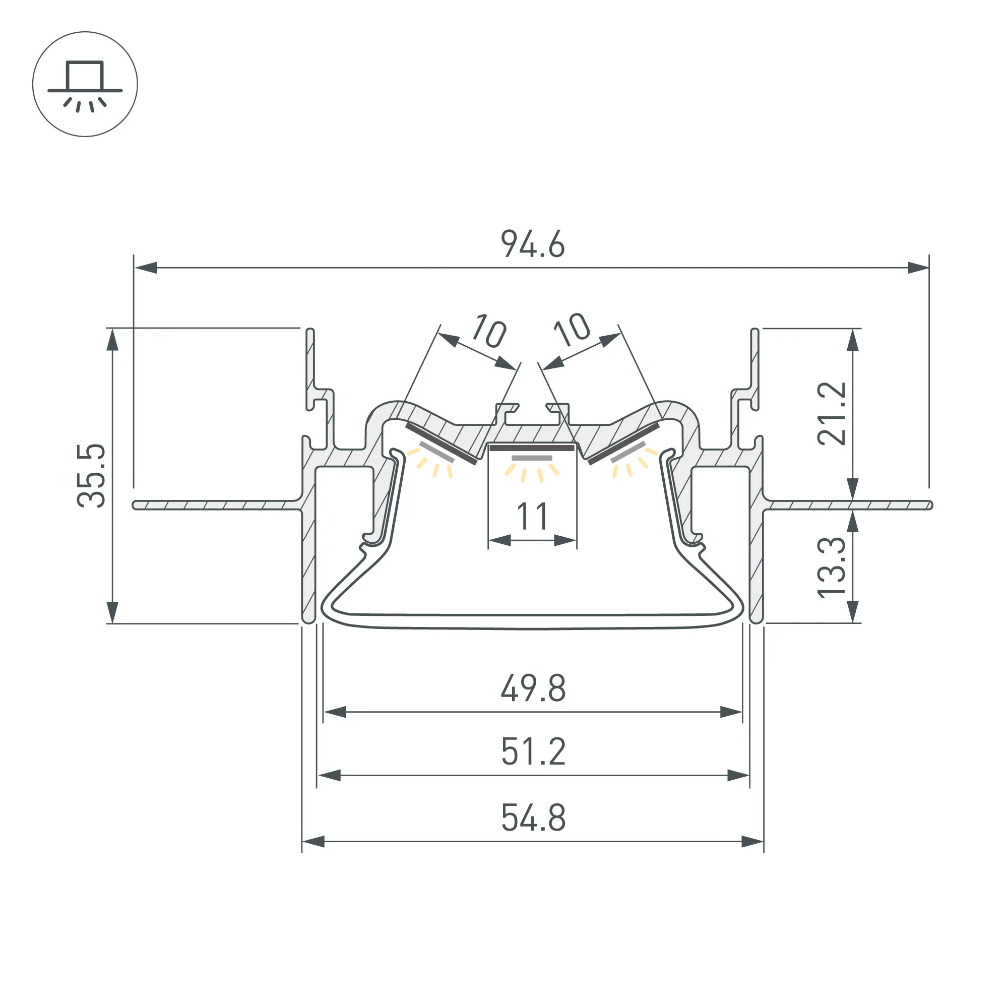 Алюминиевый профиль для натяжных потолков (центральная линия). Решение 2-в-1 - каркас для крепления натяжного потолка и профиль для установки светодиодной ленты. Для дизайнерских решений «линии света» в натяжных потолках. Монтируется к потолку подвесным (с профилем FOLED-RAIL) или накладным способом. Натяжной потолок крепится к одной или к двум боковым стенкам профиля. Габаритные размеры (L×W×H): 2000x95x36мм. Ширина центральной площадки для ленты 11мм, боковых площадок - 10 мм. Экраны, заглушки и другие аксессуары приобретаются отдельно. Цена за 1 метр.