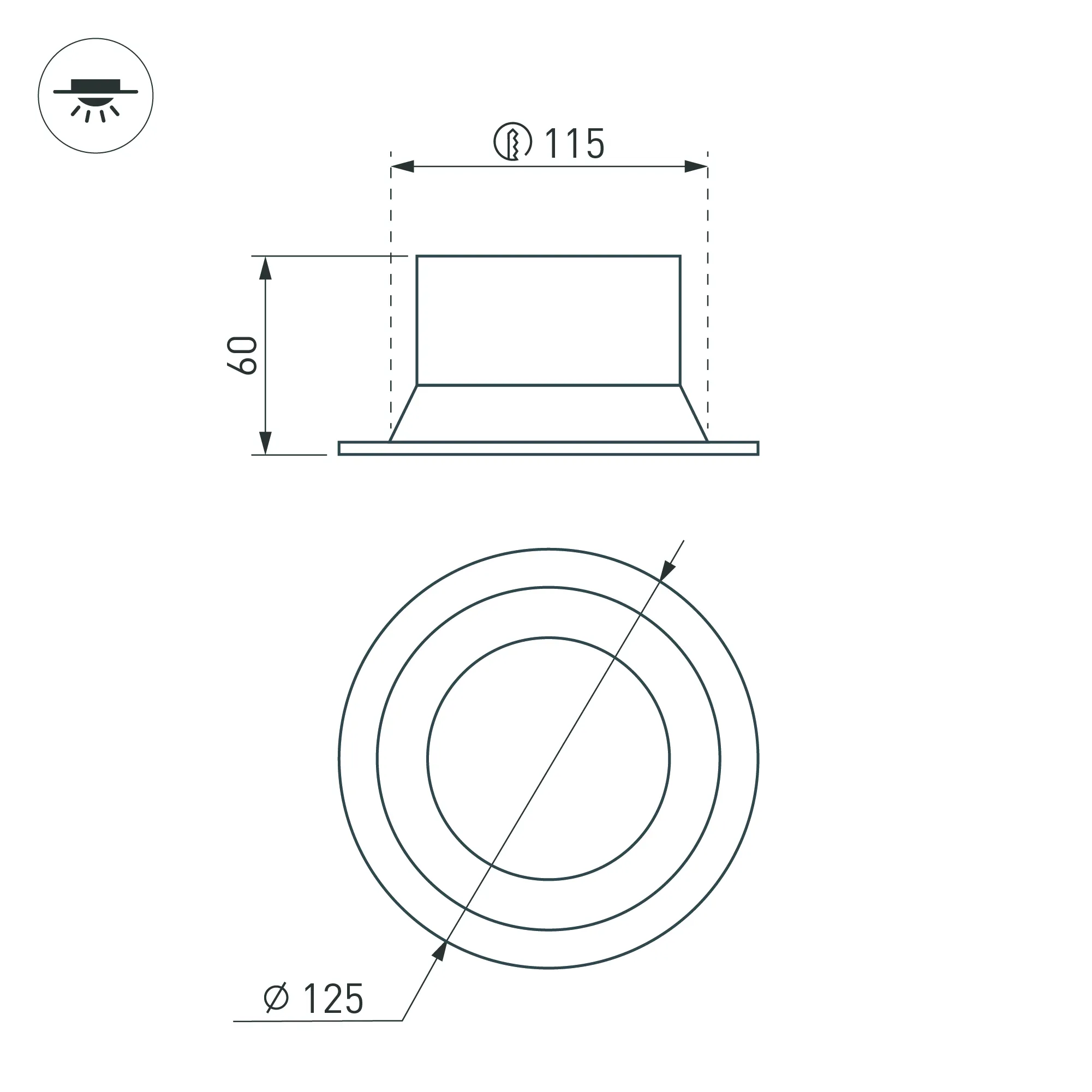 Встраиваемый светильник даунлайт. Мощность 16 Вт, св. поток 882 лм, 61 лм/Вт, тёплый 3000 K, CRI>90, угол 85°, напряжение питания 230 В. Чёрный круглый корпус из алюминия, степень защиты IP20. Размер: диаметр 125 мм, высота 60 мм. Монтаж встраиваемый, установочное отверстие: диаметр 115 мм. Драйвер 27-42 В, 400 мА, пульсация <2%.