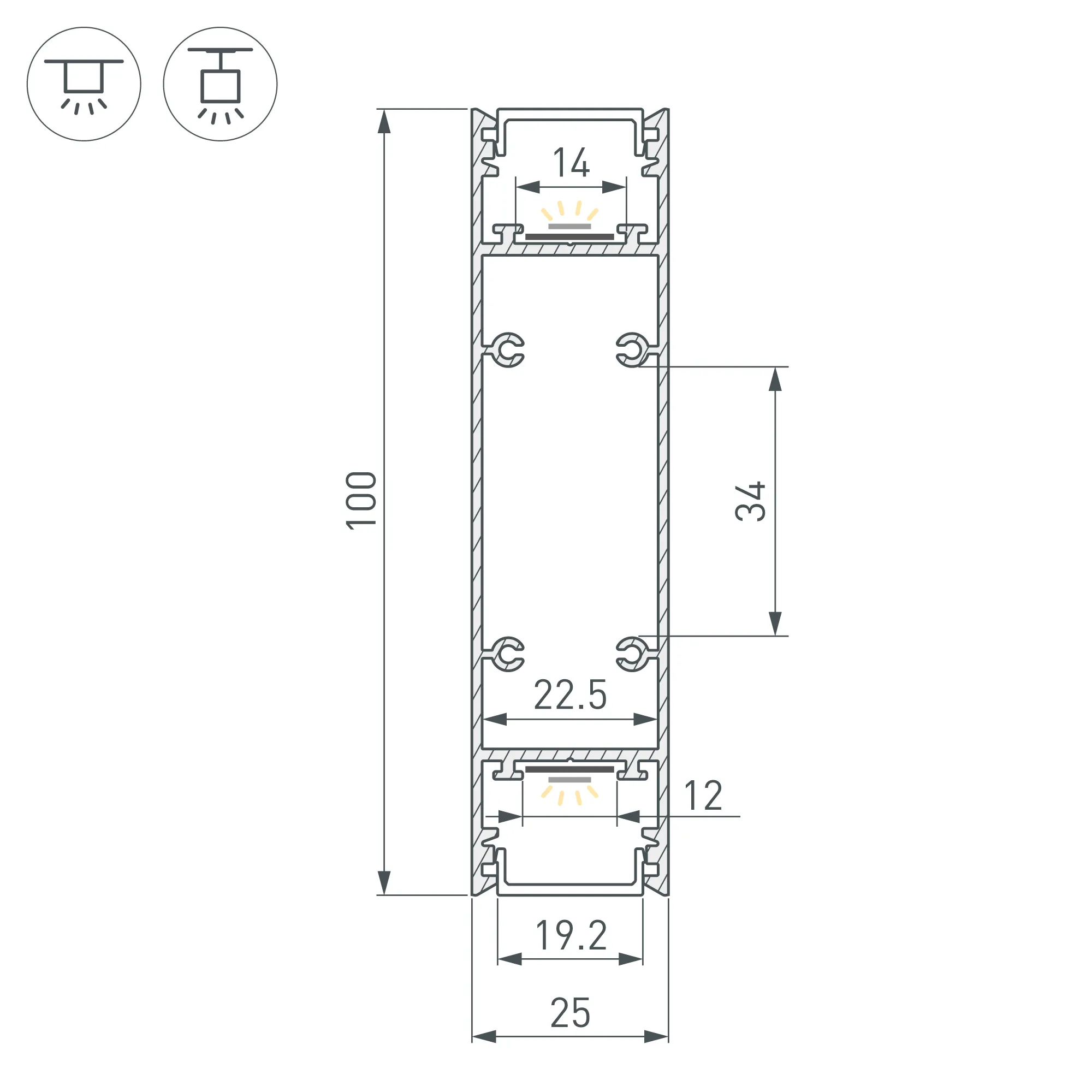 Под заказ от 20 м. Алюминиевый профиль для светодиодных лент и линеек, свечение вверх и вниз. Цвет - белый RAL9003 (порошковая окраска). Габаритные размеры (L×W×H): 2500x25x100 мм. Ширина площадки для ленты 12 мм. Экраны, заглушки и другие аксессуары приобретаются отдельно. Цена за 1 метр.