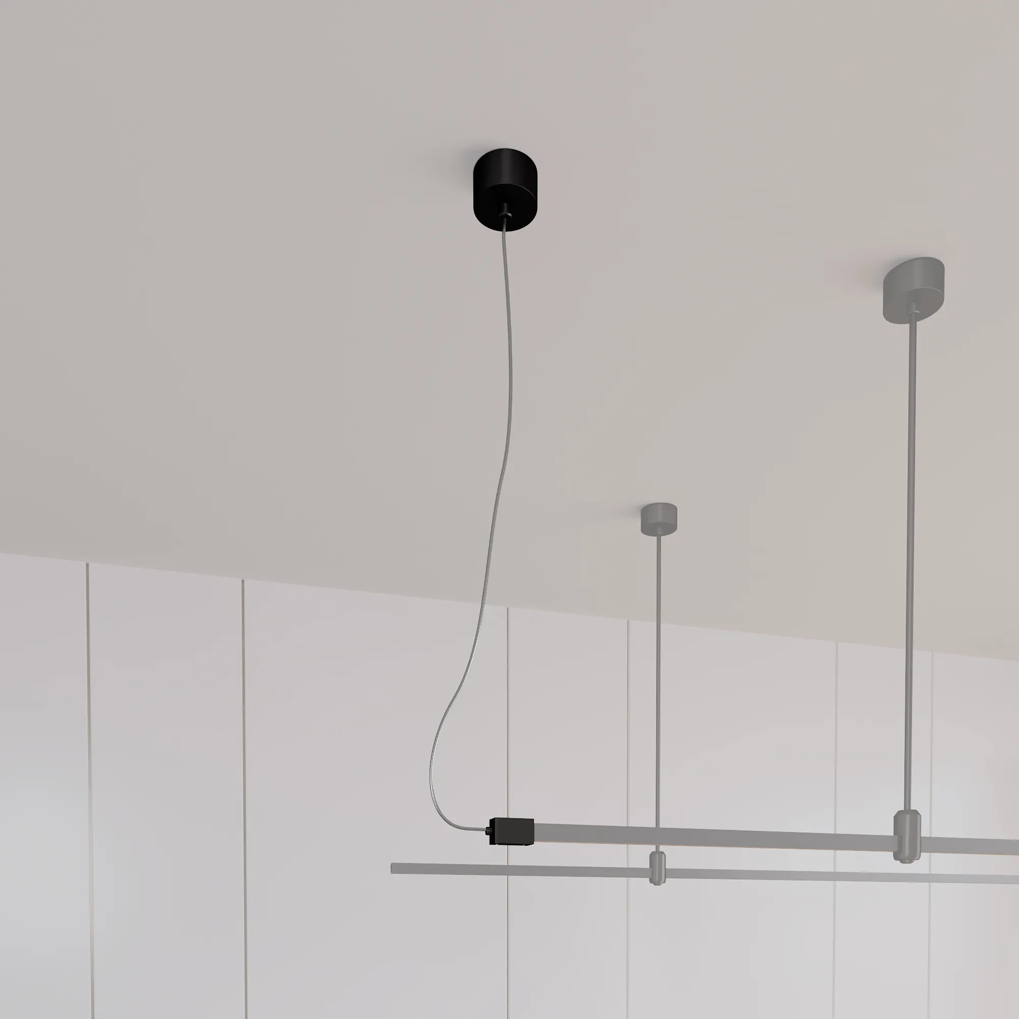 Потолочная чаша с боковым подводом питания треков системы APRIORI. Напряжение питания DC48V. Диаметр чаши 80 мм, внутренний диаметр чаши 74 мм, внешняя высота чаши 38 мм, глубина чаши до монтажного отверстия 25 мм, общая высота подвеса 1500 мм. Материал алюминий, цвет черный.