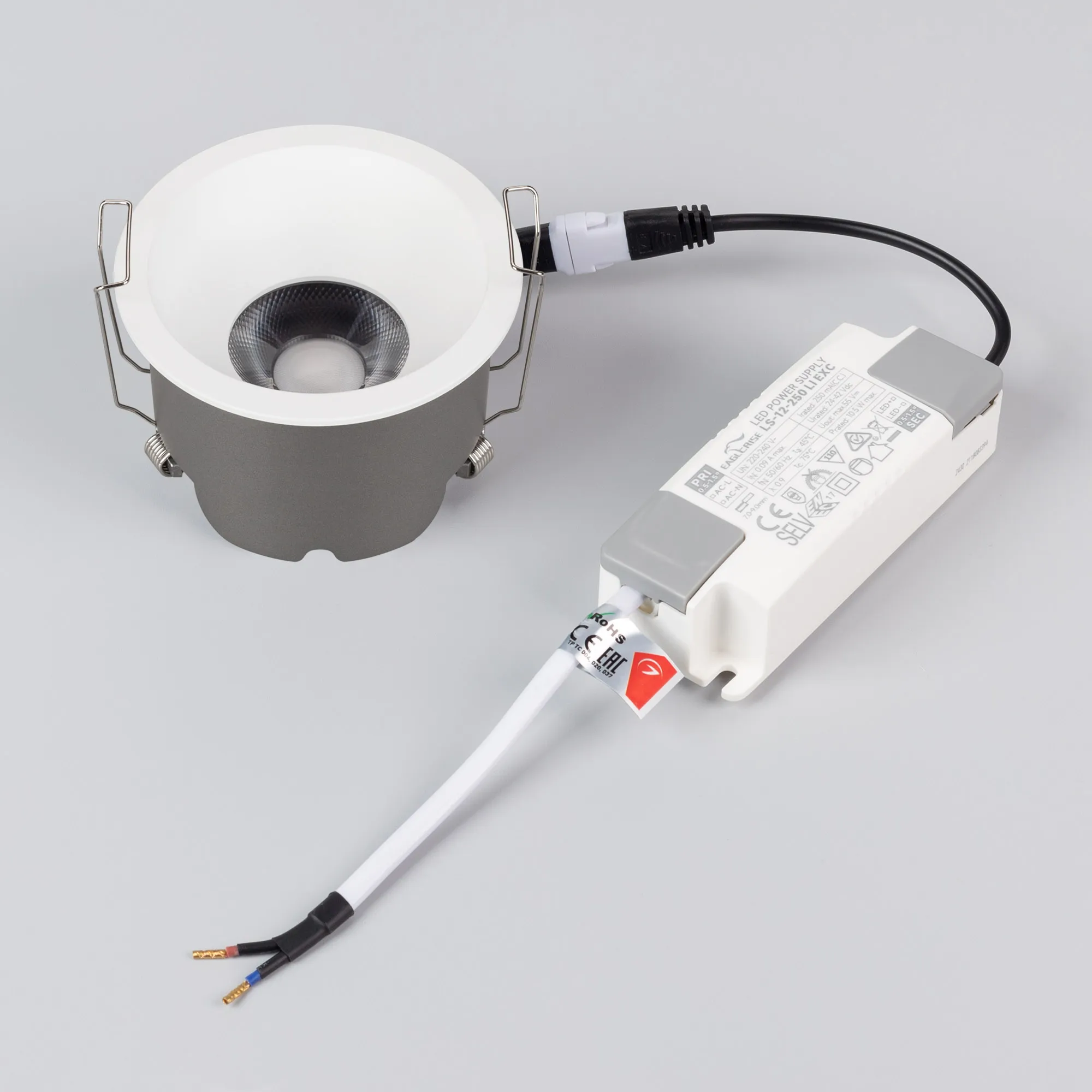 Встраиваемый светильник даунлайт. Мощность 10 Вт, св. поток 980 лм, 98 лм/Вт, дневной 4000 K, CRI>90, угол 36°, напряжение питания 230 В. Белый круглый корпус из алюминия, степень защиты IP20. Размер: диаметр 82 мм, высота 53 мм. Монтаж встраиваемый, установочное отверстие: диаметр 75 мм. UGR<14. Драйвер 30-42 В, 250 мА, пульсация <2%.